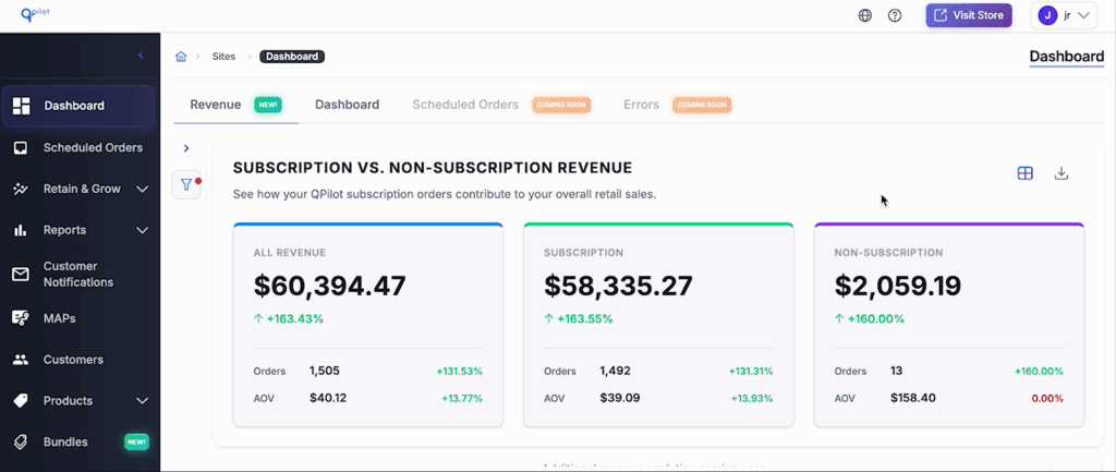 - NEW: Reporting & Analytics (Subscription + One-Time Revenue): See subscription and one-time revenue together in one stable analytics view. Pick specific date ranges and compare revenue performance, AOV changes, and understand how retention efforts actually affect one-time and recurring subscription revenue.